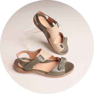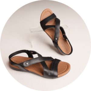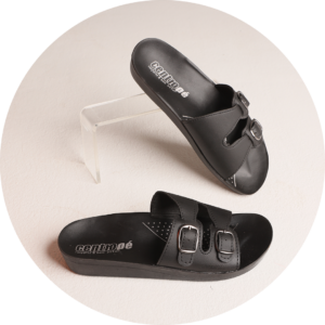 Contorno interno anatômico, proporcionando o ajuste do pé no calçado. Apresenta duas fivelas que regulam conforme a altura da parte superior do pé.